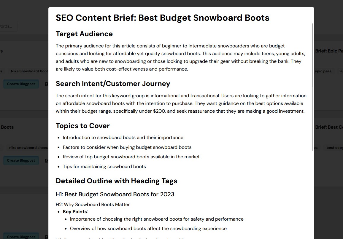 - Create the Brief: With a single click, send any keyword or an entire cluster to the AI Content Brief tool. It intelligently analyzes the SERP and generates a comprehensive outline including: